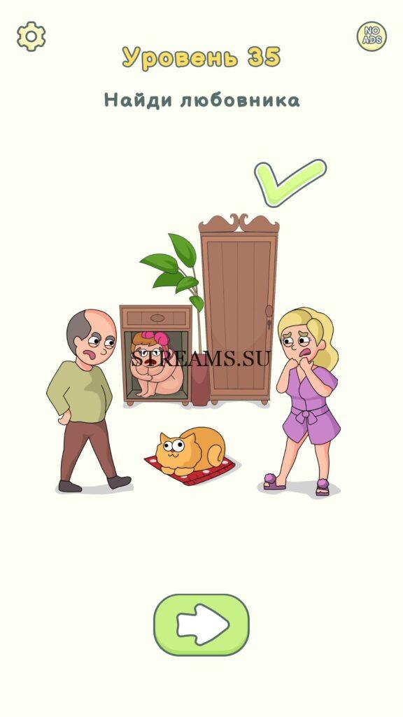Найди любовника. Уровень 35 — DOP 2: Delete One Part. Вы готовы к продолжению первой части игры? Тогда вперед! Эта игра DOP 2 (Расшифровка: Delete One Part) , которая отличается от первой части тем, что здесь нам нужно будет не дорисовывать предметы, а удалять или стирать их. Вас ждет множество хитроумных и интересных уровней. На первом этапе нам будут подсказывать, что нужно удали, но потом становится всё тяжелее и тяжелее решать головоломки. Разработчики постарались сделать игру привлекательной. Геймплей заставит вас просидеть за игрой очень долго. Красивая графика исполнения. Тренировка мозга и многое другое, всё это ждет нас в замечательной головоломке DOP 2. Если не получается пройти уровень, или зашли в тупик, то вы можете найти ответ на любой уровень на нашем сайте STREAMS.SU! Ответ на этот уровень находиться чуть ниже..