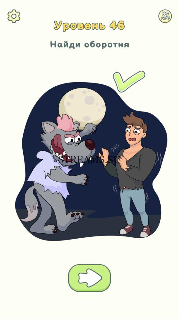 Найди оборотня. Уровень 46 — DOP 2: Delete One Part. Вы готовы к продолжению первой части игры? Тогда вперед! Эта игра DOP 2 (Расшифровка: Delete One Part) , которая отличается от первой части тем, что здесь нам нужно будет не дорисовывать предметы, а удалять или стирать их. Вас ждет множество хитроумных и интересных уровней. На первом этапе нам будут подсказывать, что нужно удали, но потом становится всё тяжелее и тяжелее решать головоломки. Разработчики постарались сделать игру привлекательной. Геймплей заставит вас просидеть за игрой очень долго. Красивая графика исполнения. Тренировка мозга и многое другое, всё это ждет нас в замечательной головоломке DOP 2. Если не получается пройти уровень, или зашли в тупик, то вы можете найти ответ на любой уровень на нашем сайте STREAMS.SU! Ответ на этот уровень находиться чуть ниже..