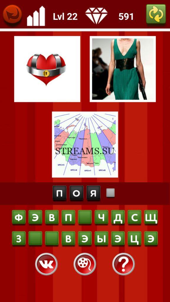 Найди общее. Уровень 22 — Где логика? — игра, которая потребует от вас максимальной сосредоточенности и внимательности. Пока что в игре существует 3 раздела. Найди общее — здесь предоставляется 3 картинки и предстоит находить, что же среди них общее, что их объединяет. С каждым последующим уровнем сложность игры будет возрастать. Поэтому приготовьтесь напрягать свой мозг всё лучше и лучше. Подмечайте какие-то малозначительные вещи. В них может крыться ответ. Чего не хватает — в этом разделе на одной фотографии предстоит найти, что забыли нарисовать или что убрали с фото. Это не всегда будет очевидно. Два в одном — здесь нужно вглядываться в фото звезд кино, чтобы найти в их лицах 2-х актеров. Вообщем игра требует внимательности и логика. На нашем сайте вы найдете все ответы на уровни этой занимательной игры!
