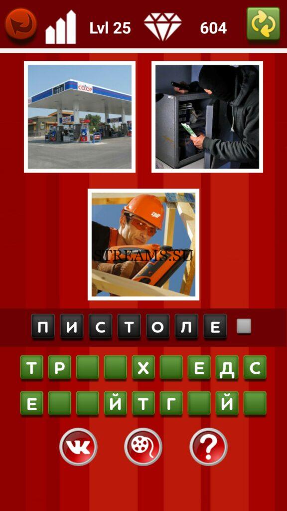 Найди общее. Уровень 25 — Где логика? — игра, которая потребует от вас максимальной сосредоточенности и внимательности. Пока что в игре существует 3 раздела. Найди общее — здесь предоставляется 3 картинки и предстоит находить, что же среди них общее, что их объединяет. С каждым последующим уровнем сложность игры будет возрастать. Поэтому приготовьтесь напрягать свой мозг всё лучше и лучше. Подмечайте какие-то малозначительные вещи. В них может крыться ответ. Чего не хватает — в этом разделе на одной фотографии предстоит найти, что забыли нарисовать или что убрали с фото. Это не всегда будет очевидно. Два в одном — здесь нужно вглядываться в фото звезд кино, чтобы найти в их лицах 2-х актеров. Вообщем игра требует внимательности и логика. На нашем сайте вы найдете все ответы на уровни этой занимательной игры!