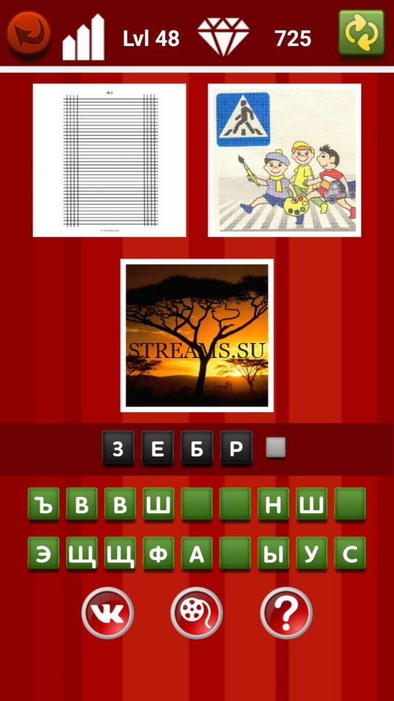 Найди общее. Уровень 48 — Где логика? — игра, которая потребует от вас максимальной сосредоточенности и внимательности. Пока что в игре существует 3 раздела. Найди общее — здесь предоставляется 3 картинки и предстоит находить, что же среди них общее, что их объединяет. С каждым последующим уровнем сложность игры будет возрастать. Поэтому приготовьтесь напрягать свой мозг всё лучше и лучше. Подмечайте какие-то малозначительные вещи. В них может крыться ответ. Чего не хватает — в этом разделе на одной фотографии предстоит найти, что забыли нарисовать или что убрали с фото. Это не всегда будет очевидно. Два в одном — здесь нужно вглядываться в фото звезд кино, чтобы найти в их лицах 2-х актеров. Вообщем игра требует внимательности и логика. На нашем сайте вы найдете все ответы на уровни этой занимательной игры!