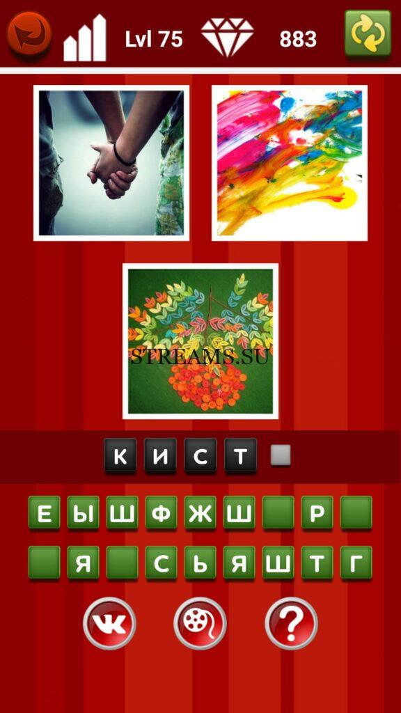 Найди общее. Уровень 75 — Где логика? — игра, которая потребует от вас максимальной сосредоточенности и внимательности. Пока что в игре существует 3 раздела. Найди общее — здесь предоставляется 3 картинки и предстоит находить, что же среди них общее, что их объединяет. С каждым последующим уровнем сложность игры будет возрастать. Поэтому приготовьтесь напрягать свой мозг всё лучше и лучше. Подмечайте какие-то малозначительные вещи. В них может крыться ответ. Чего не хватает — в этом разделе на одной фотографии предстоит найти, что забыли нарисовать или что убрали с фото. Это не всегда будет очевидно. Два в одном — здесь нужно вглядываться в фото звезд кино, чтобы найти в их лицах 2-х актеров. Вообщем игра требует внимательности и логика. На нашем сайте вы найдете все ответы на уровни этой занимательной игры!