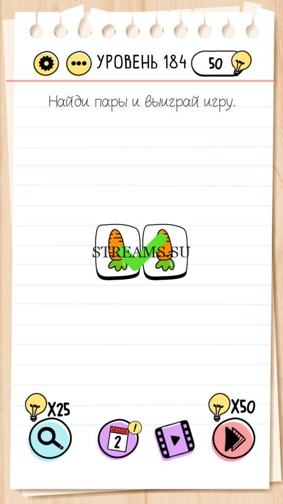 Найди пары и выиграй игру. Уровень 184 — Brain Test — Это самая популярная головоломка, в которой вам предстоит разгадывать непростые задачки. Нужно будет искать нестандартные решения. Название игры говорит само за себя (Тест мозга). С её помощью вы сможете повысить свой IQ, и интеллект. Иногда ответ может быть очень прост. Вы можете играть в компании друзей или родных. Брейн Тест, это отличный способ провести время с пользой и узнать насколько ты умный. Но если вы не можете решить один или несколько уровней, то воспользуйтесь подсказками с нашего сайта.