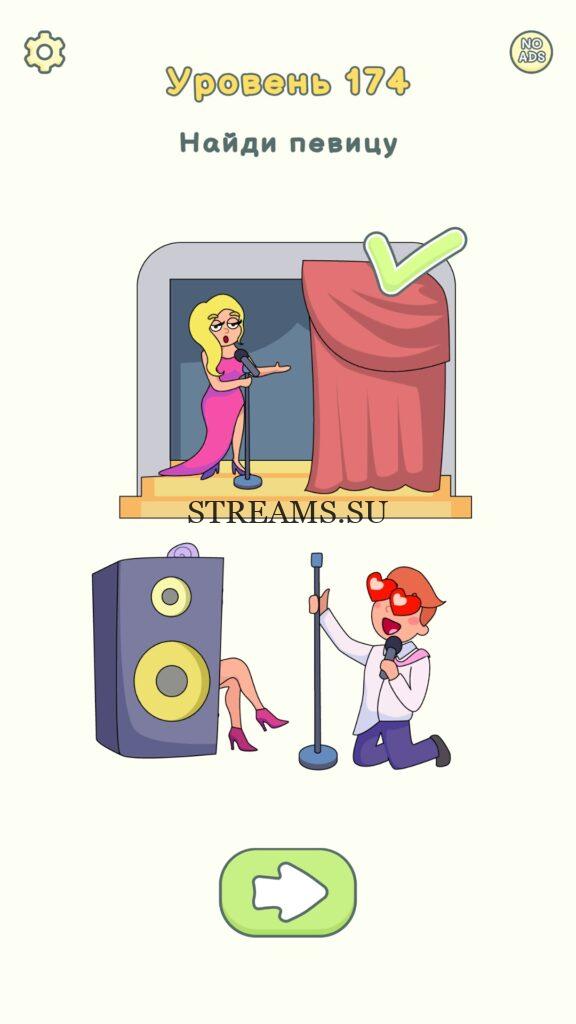 Найди певицу. Уровень 174 — DOP 2: Delete One Part. Вы готовы к продолжению первой части игры? Тогда вперед! Эта игра DOP 2 (Расшифровка: Delete One Part) , которая отличается от первой части тем, что здесь нам нужно будет не дорисовывать предметы, а удалять или стирать их. Вас ждет множество хитроумных и интересных уровней. На первом этапе нам будут подсказывать, что нужно удали, но потом становится всё тяжелее и тяжелее решать головоломки. Разработчики постарались сделать игру привлекательной. Геймплей заставит вас просидеть за игрой очень долго. Красивая графика исполнения. Тренировка мозга и многое другое, всё это ждет нас в замечательной головоломке DOP 2. Если не получается пройти уровень, или зашли в тупик, то вы можете найти ответ на любой уровень на нашем сайте STREAMS.SU! Ответ на этот уровень находиться чуть ниже..