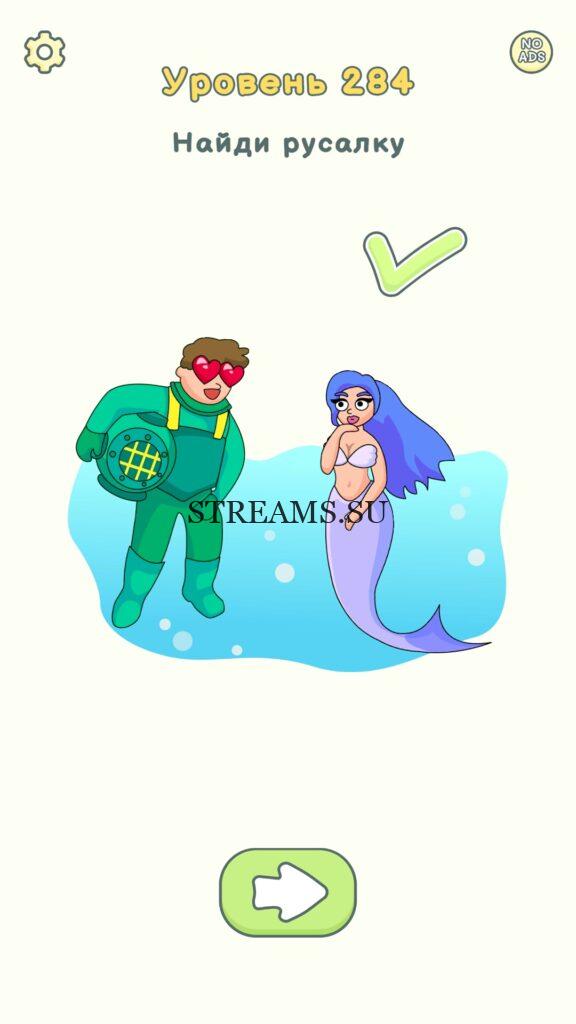 Найди русалку. Уровень 284 — DOP 2: Delete One Part. Вы готовы к продолжению первой части игры? Тогда вперед! Эта игра DOP 2 (Расшифровка: Delete One Part) , которая отличается от первой части тем, что здесь нам нужно будет не дорисовывать предметы, а удалять или стирать их. Вас ждет множество хитроумных и интересных уровней. На первом этапе нам будут подсказывать, что нужно удали, но потом становится всё тяжелее и тяжелее решать головоломки. Разработчики постарались сделать игру привлекательной. Геймплей заставит вас просидеть за игрой очень долго. Красивая графика исполнения. Тренировка мозга и многое другое, всё это ждет нас в замечательной головоломке DOP 2. Если не получается пройти уровень, или зашли в тупик, то вы можете найти ответ на любой уровень на нашем сайте STREAMS.SU! Ответ на этот уровень находиться чуть ниже..