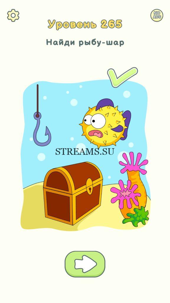 Найди рыбу-шар. Уровень 265 — DOP 2: Delete One Part. Вы готовы к продолжению первой части игры? Тогда вперед! Эта игра DOP 2 (Расшифровка: Delete One Part) , которая отличается от первой части тем, что здесь нам нужно будет не дорисовывать предметы, а удалять или стирать их. Вас ждет множество хитроумных и интересных уровней. На первом этапе нам будут подсказывать, что нужно удали, но потом становится всё тяжелее и тяжелее решать головоломки. Разработчики постарались сделать игру привлекательной. Геймплей заставит вас просидеть за игрой очень долго. Красивая графика исполнения. Тренировка мозга и многое другое, всё это ждет нас в замечательной головоломке DOP 2. Если не получается пройти уровень, или зашли в тупик, то вы можете найти ответ на любой уровень на нашем сайте STREAMS.SU! Ответ на этот уровень находиться чуть ниже..