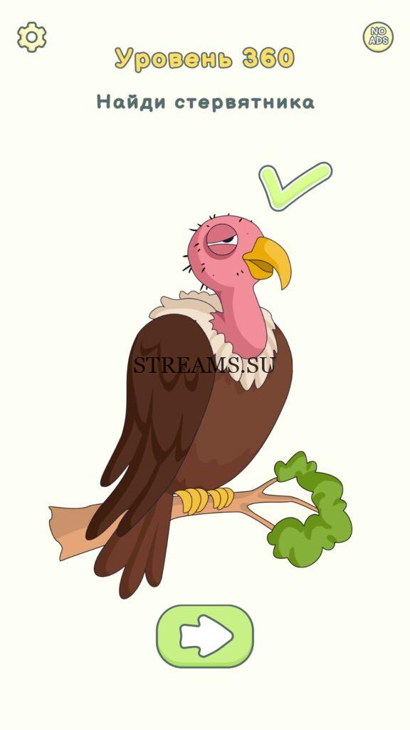 Найди стервятника. Уровень 360 — DOP 2: Delete One Part. Вы готовы к продолжению первой части игры? Тогда вперед! Эта игра DOP 2 (Расшифровка: Delete One Part) , которая отличается от первой части тем, что здесь нам нужно будет не дорисовывать предметы, а удалять или стирать их. Вас ждет множество хитроумных и интересных уровней. На первом этапе нам будут подсказывать, что нужно удали, но потом становится всё тяжелее и тяжелее решать головоломки. Разработчики постарались сделать игру привлекательной. Геймплей заставит вас просидеть за игрой очень долго. Красивая графика исполнения. Тренировка мозга и многое другое, всё это ждет нас в замечательной головоломке DOP 2. Если не получается пройти уровень, или зашли в тупик, то вы можете найти ответ на любой уровень на нашем сайте STREAMS.SU! Ответ на этот уровень находиться чуть ниже..