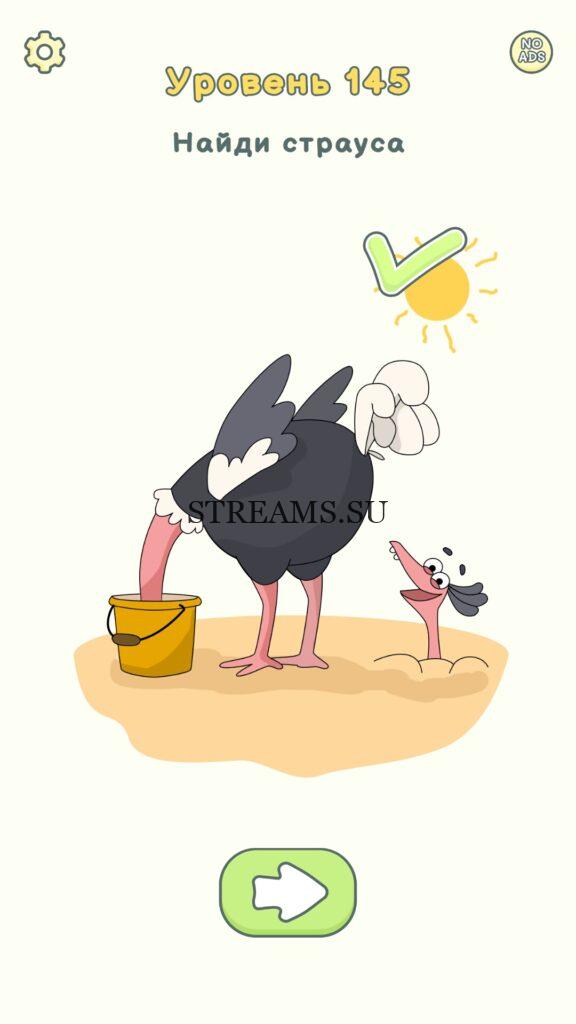 Найди страуса. Уровень 145 — DOP 2: Delete One Part. Вы готовы к продолжению первой части игры? Тогда вперед! Эта игра DOP 2 (Расшифровка: Delete One Part) , которая отличается от первой части тем, что здесь нам нужно будет не дорисовывать предметы, а удалять или стирать их. Вас ждет множество хитроумных и интересных уровней. На первом этапе нам будут подсказывать, что нужно удали, но потом становится всё тяжелее и тяжелее решать головоломки. Разработчики постарались сделать игру привлекательной. Геймплей заставит вас просидеть за игрой очень долго. Красивая графика исполнения. Тренировка мозга и многое другое, всё это ждет нас в замечательной головоломке DOP 2. Если не получается пройти уровень, или зашли в тупик, то вы можете найти ответ на любой уровень на нашем сайте STREAMS.SU! Ответ на этот уровень находиться чуть ниже..