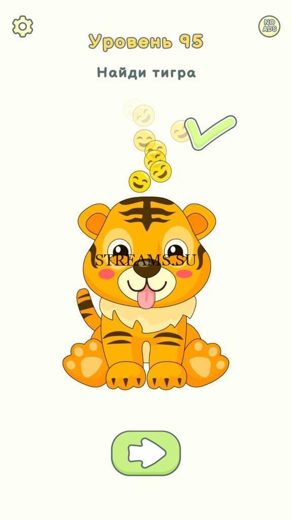 Найди тигра. Уровень 95 — DOP 2: Delete One Part. Вы готовы к продолжению первой части игры? Тогда вперед! Эта игра DOP 2 (Расшифровка: Delete One Part) , которая отличается от первой части тем, что здесь нам нужно будет не дорисовывать предметы, а удалять или стирать их. Вас ждет множество хитроумных и интересных уровней. На первом этапе нам будут подсказывать, что нужно удали, но потом становится всё тяжелее и тяжелее решать головоломки. Разработчики постарались сделать игру привлекательной. Геймплей заставит вас просидеть за игрой очень долго. Красивая графика исполнения. Тренировка мозга и многое другое, всё это ждет нас в замечательной головоломке DOP 2. Если не получается пройти уровень, или зашли в тупик, то вы можете найти ответ на любой уровень на нашем сайте STREAMS.SU! Ответ на этот уровень находиться чуть ниже..