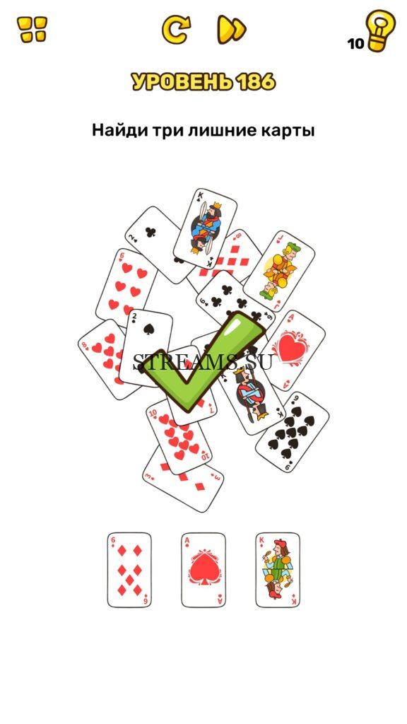 Найди три лишние карты. Уровень 186 — Brain Blow: Тест на гениальность — Ответ на этот уровень находится под фото. Очередная игра от популярных разработчиков головоломок CASUAL AZUR GAMES. Если вы хотите взорвать свой мозг и развить навыки нестандартного мышления, тогда игра Брейн Блоу определенно вам понравится. Если не получается решить задание, то попробуйте включить нестандартное мышление, тряхнуть телефон, погладить его или использовать больше пальцев. Эта игра способна развить в вас навыки следопыта, креативность и прокачать ваш IQ. Но, а если все-же не получается пройти уровень, найдите правильное решение на нашем сайте.