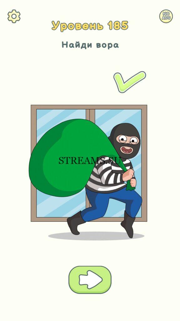 Найди вора. Уровень 185 — DOP 2: Delete One Part. Вы готовы к продолжению первой части игры? Тогда вперед! Эта игра DOP 2 (Расшифровка: Delete One Part) , которая отличается от первой части тем, что здесь нам нужно будет не дорисовывать предметы, а удалять или стирать их. Вас ждет множество хитроумных и интересных уровней. На первом этапе нам будут подсказывать, что нужно удали, но потом становится всё тяжелее и тяжелее решать головоломки. Разработчики постарались сделать игру привлекательной. Геймплей заставит вас просидеть за игрой очень долго. Красивая графика исполнения. Тренировка мозга и многое другое, всё это ждет нас в замечательной головоломке DOP 2. Если не получается пройти уровень, или зашли в тупик, то вы можете найти ответ на любой уровень на нашем сайте STREAMS.SU! Ответ на этот уровень находиться чуть ниже..