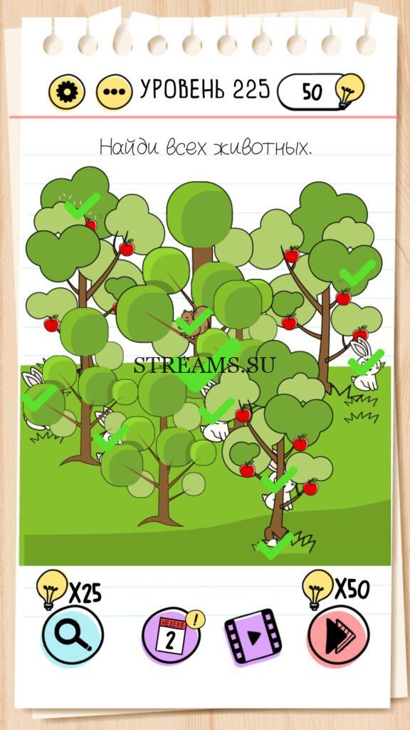 Найди всех животных. Уровень 225 — Brain Testt — Это самая популярная головоломка, в которой вам предстоит разгадывать непростые задачки. Нужно будет искать нестандартные решения. Название игры говорит само за себя (Тест мозга). С её помощью вы сможете повысить свой IQ, и интеллект. Иногда ответ может быть очень прост. Вы можете играть в компании друзей или родных. Брейн Тест, это отличный способ провести время с пользой и узнать насколько ты умный. Но если вы не можете решить один или несколько уровней, то воспользуйтесь подсказками с нашего сайта.