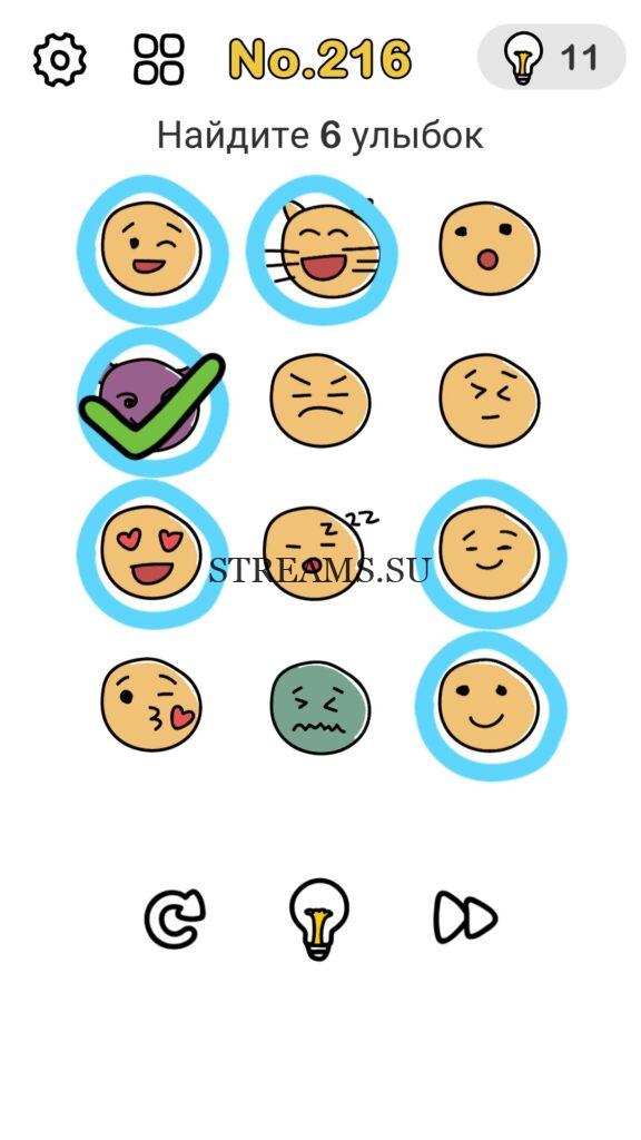 Найдите 6 улыбок. Уровень 216 — Brain Out: Ответ на этот уровень находится чуть ниже. Всегда было интересно узнать каков твой IQ? Эта игра поможет тебе узнать ответ на этот вопрос! В ней встречаются как логические загадки, так и не очень. С помощью этой интересной головоломки вы сможете развить нестандартное мышление, креативность, воображение а также улучшить способность запоминать. Некоторые решения задач, могут показаться абсурдными. Играйте в Brain Out с друзьями и родственниками. А если у вас не получается пройти один или несколько уровней, вы можете воспользоваться подсказками с нашего сайта.