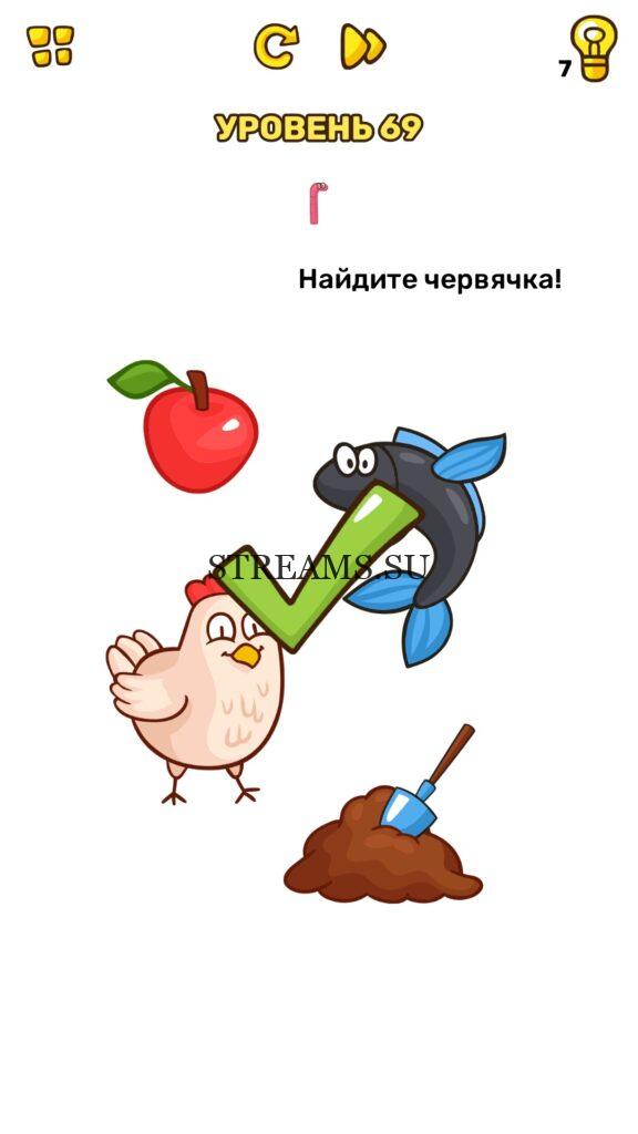 Найдите червячка! Уровень 69 — Brain Blow: Тест на гениальность — Ответ на этот уровень находится под фото. Очередная игра от популярных разработчиков головоломок CASUAL AZUR GAMES. Если вы хотите взорвать свой мозг и развить навыки нестандартного мышления, тогда игра Брейн Блоу определенно вам понравится. Если не получается решить задание, то попробуйте включить нестандартное мышление, тряхнуть телефон, погладить его или использовать больше пальцев. Эта игра способна развить в вас навыки следопыта, креативность и прокачать ваш IQ. Но, а если все-же не получается пройти уровень, найдите правильное решение на нашем сайте.