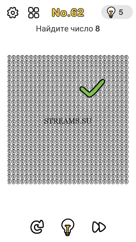 Найдите число 8. Уровень 62 — Brain Out: Ответ на этот уровень находится чуть ниже. Всегда было интересно узнать каков твой IQ? Эта игра поможет тебе узнать ответ на этот вопрос! В ней встречаются как логические загадки, так и не очень. С помощью этой интересной головоломки вы сможете развить нестандартное мышление, креативность, воображение а также улучшить способность запоминать. Некоторые решения задач, могут показаться абсурдными. Играйте в Brain Out с друзьями и родственниками. А если у вас не получается пройти один или несколько уровней, вы можете воспользоваться подсказками с нашего сайта.