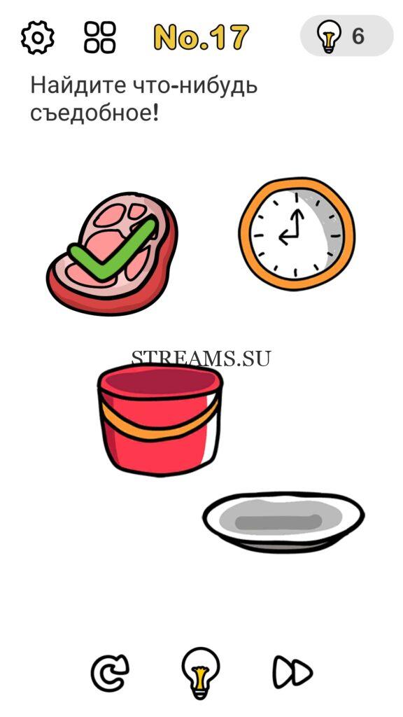 Найдите что-нибудь съедобное! Уровень 17 — Brain Out: Ответ на этот уровень находится чуть ниже. Всегда было интересно узнать каков твой IQ? Эта игра поможет тебе узнать ответ на этот вопрос! В ней встречаются как логические загадки, так и не очень. С помощью этой интересной головоломки вы сможете развить нестандартное мышление, креативность, воображение а также улучшить способность запоминать. Некоторые решения задач, могут показаться абсурдными. Играйте в Brain Out с друзьями и родственниками. А если у вас не получается пройти один или несколько уровней, вы можете воспользоваться подсказками с нашего сайта.