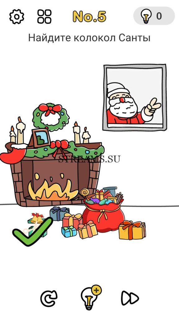 Найдите колокол Санты. (В поисках Санты) Уровень 5 — Brain Out: Ответ на этот уровень находится чуть ниже. Всегда было интересно узнать каков твой IQ? Эта игра поможет тебе узнать ответ на этот вопрос! В ней встречаются как логические загадки, так и не очень. С помощью этой интересной головоломки вы сможете развить нестандартное мышление, креативность, воображение а также улучшить способность запоминать. Некоторые решения задач, могут показаться абсурдными. Играйте в Brain Out с друзьями и родственниками. А если у вас не получается пройти один или несколько уровней, вы можете воспользоваться подсказками с нашего сайта.