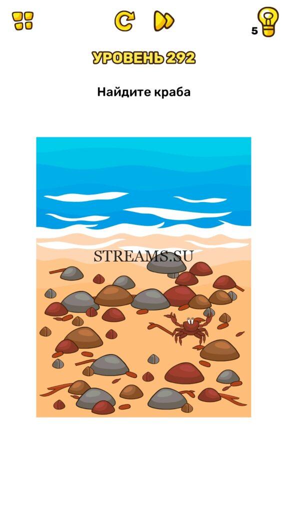 Найдите краба. Уровень 292 — Brain Blow: Тест на гениальность — Ответ на этот уровень находится под фото. Очередная игра от популярных разработчиков головоломок CASUAL AZUR GAMES. Если вы хотите взорвать свой мозг и развить навыки нестандартного мышления, тогда игра Брейн Блоу определенно вам понравится. Если не получается решить задание, то попробуйте включить нестандартное мышление, тряхнуть телефон, погладить его или использовать больше пальцев. Эта игра способна развить в вас навыки следопыта, креативность и прокачать ваш IQ. Но, а если все-же не получается пройти уровень, найдите правильное решение на нашем сайте.