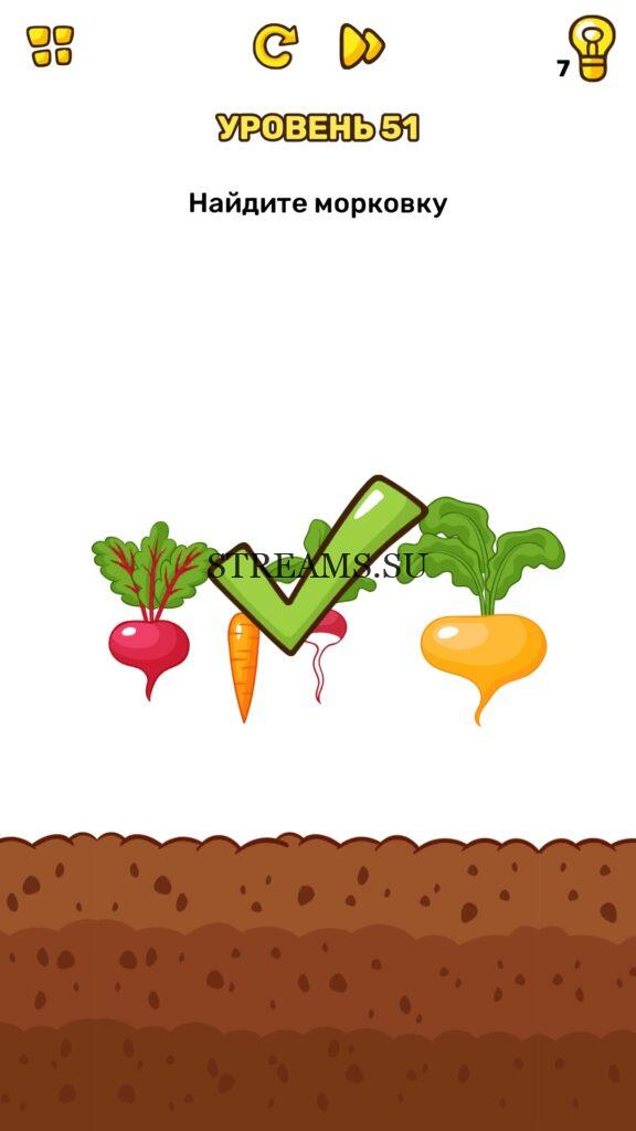 Найдите морковку. Уровень 51 — Brain Blow: Тест на гениальность — Ответ на этот уровень находится под фото. Очередная игра от популярных разработчиков головоломок CASUAL AZUR GAMES. Если вы хотите взорвать свой мозг и развить навыки нестандартного мышления, тогда игра Брейн Блоу определенно вам понравится. Если не получается решить задание, то попробуйте включить нестандартное мышление, тряхнуть телефон, погладить его или использовать больше пальцев. Эта игра способна развить в вас навыки следопыта, креативность и прокачать ваш IQ. Но, а если все-же не получается пройти уровень, найдите правильное решение на нашем сайте.