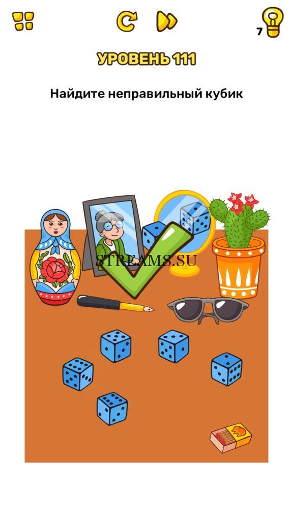 Найдите неправильный кубик. Уровень 111 — Brain Blow: Тест на гениальность — Ответ на этот уровень находится под фото. Очередная игра от популярных разработчиков головоломок CASUAL AZUR GAMES. Если вы хотите взорвать свой мозг и развить навыки нестандартного мышления, тогда игра Брейн Блоу определенно вам понравится. Если не получается решить задание, то попробуйте включить нестандартное мышление, тряхнуть телефон, погладить его или использовать больше пальцев. Эта игра способна развить в вас навыки следопыта, креативность и прокачать ваш IQ. Но, а если все-же не получается пройти уровень, найдите правильное решение на нашем сайте.