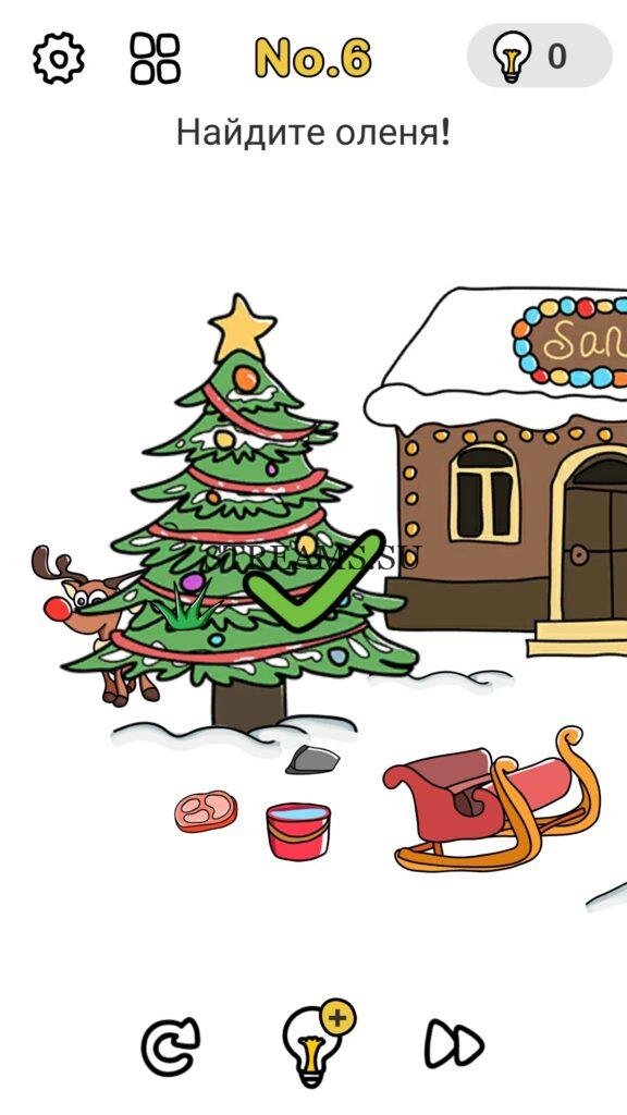 Найдите оленя! (В поисках Санты) Уровень 6 — Brain Out: Ответ на этот уровень находится чуть ниже. Всегда было интересно узнать каков твой IQ? Эта игра поможет тебе узнать ответ на этот вопрос! В ней встречаются как логические загадки, так и не очень. С помощью этой интересной головоломки вы сможете развить нестандартное мышление, креативность, воображение а также улучшить способность запоминать. Некоторые решения задач, могут показаться абсурдными. Играйте в Brain Out с друзьями и родственниками. А если у вас не получается пройти один или несколько уровней, вы можете воспользоваться подсказками с нашего сайта.