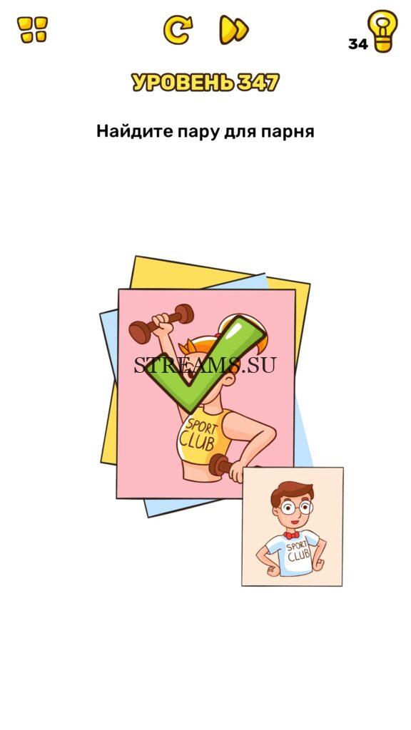 Найдите пару для парня. Уровень 347 — Brain Blow: Тест на гениальность — Ответ на этот уровень находится под фото. Очередная игра от популярных разработчиков головоломок CASUAL AZUR GAMES. Если вы хотите взорвать свой мозг и развить навыки нестандартного мышления, тогда игра Брейн Блоу определенно вам понравится. Если не получается решить задание, то попробуйте включить нестандартное мышление, тряхнуть телефон, погладить его или использовать больше пальцев. Эта игра способна развить в вас навыки следопыта, креативность и прокачать ваш IQ. Но, а если все-же не получается пройти уровень, найдите правильное решение на нашем сайте.