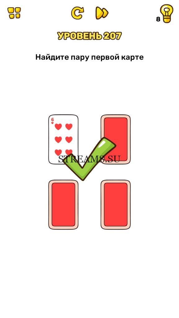 Найдите пару первой карте. Уровень 207 — Brain Blow: Тест на гениальность — Ответ на этот уровень находится под фото. Очередная игра от популярных разработчиков головоломок CASUAL AZUR GAMES. Если вы хотите взорвать свой мозг и развить навыки нестандартного мышления, тогда игра Брейн Блоу определенно вам понравится. Если не получается решить задание, то попробуйте включить нестандартное мышление, тряхнуть телефон, погладить его или использовать больше пальцев. Эта игра способна развить в вас навыки следопыта, креативность и прокачать ваш IQ. Но, а если все-же не получается пройти уровень, найдите правильное решение на нашем сайте.