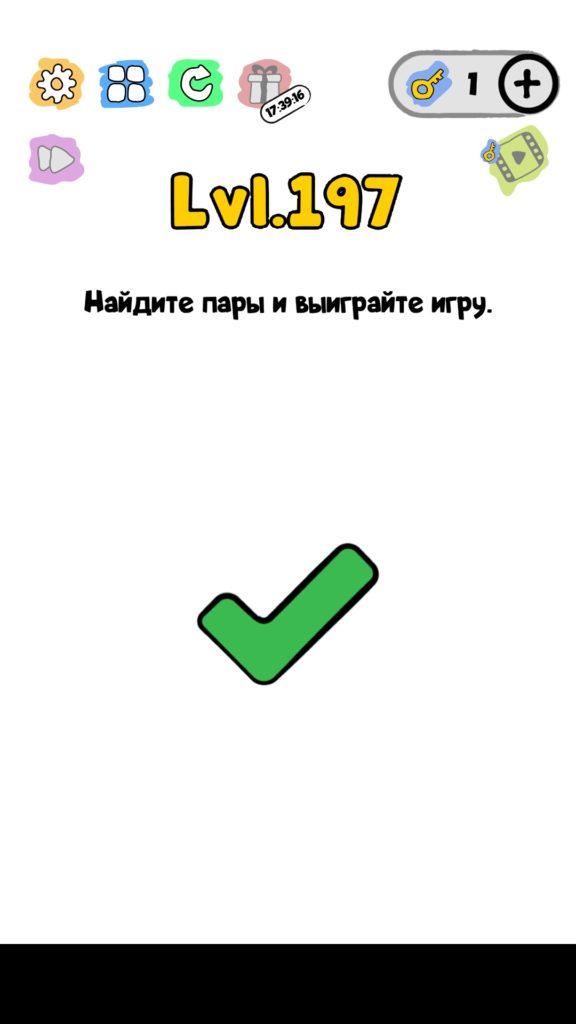 Найдите пары и выиграйте игру. 197 уровень Trick Me: логические головоломки — Это игра созданная в виде викторины. Каждый новый уровень отличается от предыдущего, что делает игровой процесс затягивающим и интересным. Если ты хочешь узнать насколько ты умный, тогда эта игра точно для тебя! Trick Me поможет тебе развить нестандартное мышление, и повысить свой IQ. В этой игре уже есть 236 уровней, которые постоянно обновляются и пополняются. Но если застрял на одном или нескольких уровнях, и не можешь их пройти, то наш сайт придет на помощь, у нас есть все ответы на уровни игры Trick Me.