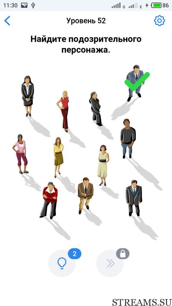 Найдите подозрительного персонажа. 52 уровень Easy Game — это интересная но в тоже время сложная головоломка, которая заставит вас включить нестандартное мышление. Прокачайте свой мозг и IQ. Почувствуйте себя самым умным, решая захватывающие и заковыристые задачки. Разработчики Easybrain, обещают, что с помощью этой игры вы сможете развить творческие навыки. Но если не сможете пройти какой-нибудь из уровней, то воспользуйтесь ответами с нашего сайта.