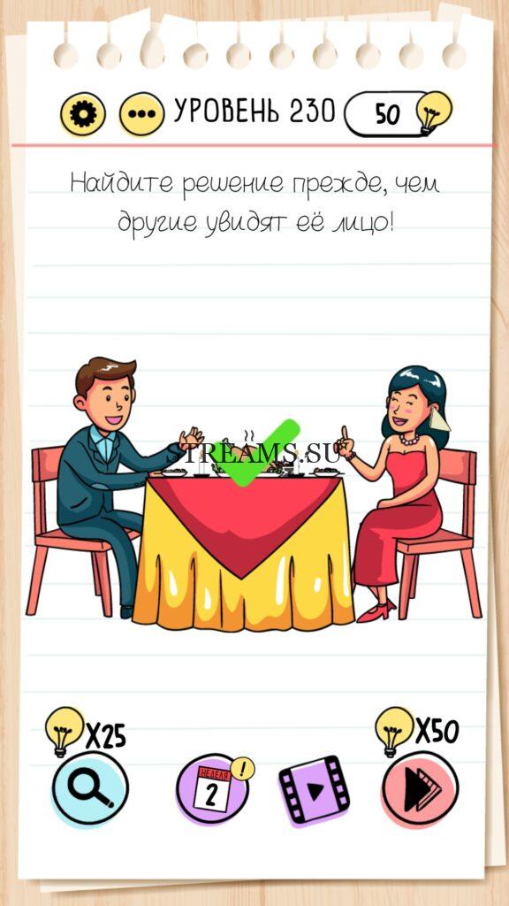 Найдите решение прежде, чем другие увидят её лицо! Уровень 230 — Brain Test — Это самая популярная головоломка, в которой вам предстоит разгадывать непростые задачки. Нужно будет искать нестандартные решения. Название игры говорит само за себя (Тест мозга). С её помощью вы сможете повысить свой IQ, и интеллект. Иногда ответ может быть очень прост. Вы можете играть в компании друзей или родных. Брейн Тест, это отличный способ провести время с пользой и узнать насколько ты умный. Но если вы не можете решить один или несколько уровней, то воспользуйтесь подсказками с нашего сайта.