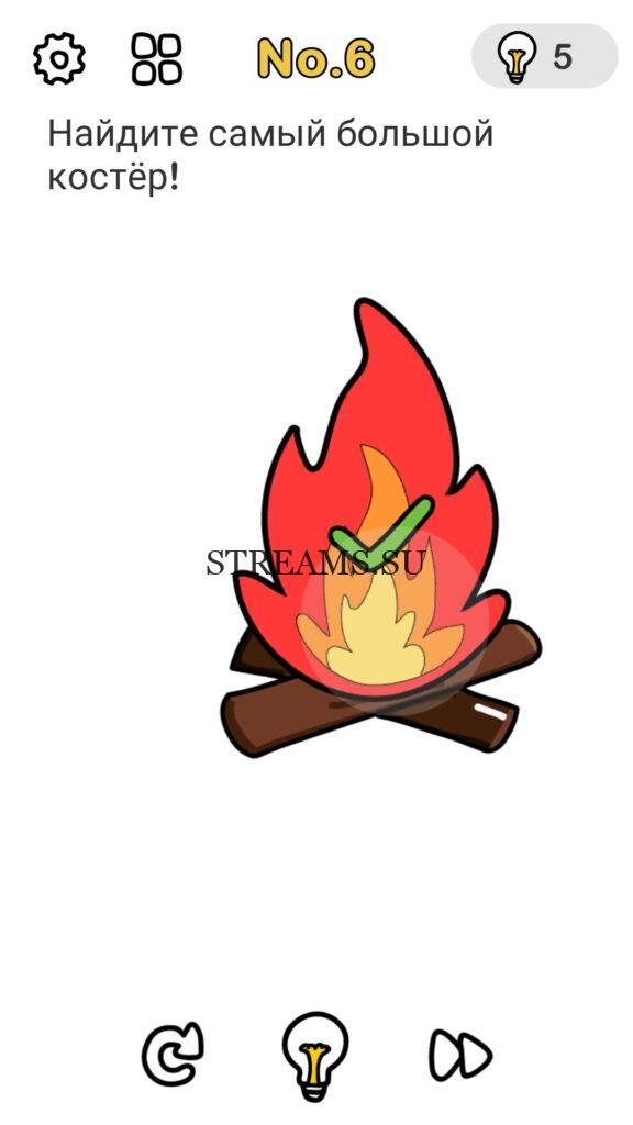 Найдите самый большой костёр! Уровень 6 — Brain Out: Ответ на этот уровень находится чуть ниже. Всегда было интересно узнать каков твой IQ? Эта игра поможет тебе узнать ответ на этот вопрос! В ней встречаются как логические загадки, так и не очень. С помощью этой интересной головоломки вы сможете развить нестандартное мышление, креативность, воображение а также улучшить способность запоминать. Некоторые решения задач, могут показаться абсурдными. Играйте в Brain Out с друзьями и родственниками. А если у вас не получается пройти один или несколько уровней, вы можете воспользоваться подсказками с нашего сайта.
