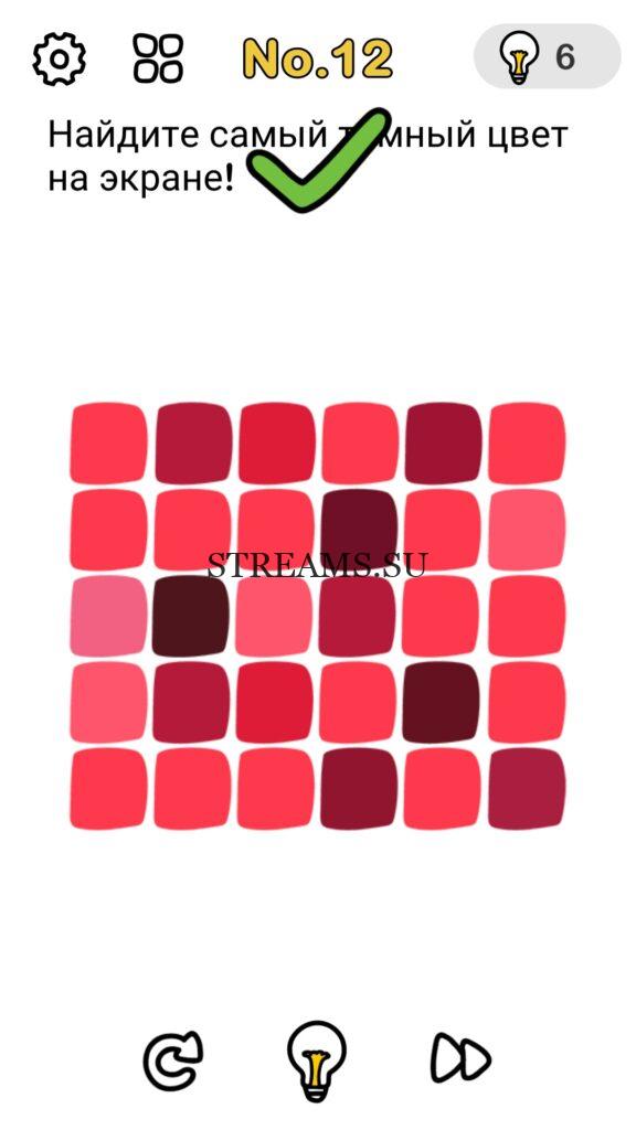 Найдите самый темный цвет на экране! Уровень 12 — Brain Out: Ответ на этот уровень находится чуть ниже. Всегда было интересно узнать каков твой IQ? Эта игра поможет тебе узнать ответ на этот вопрос! В ней встречаются как логические загадки, так и не очень. С помощью этой интересной головоломки вы сможете развить нестандартное мышление, креативность, воображение а также улучшить способность запоминать. Некоторые решения задач, могут показаться абсурдными. Играйте в Brain Out с друзьями и родственниками. А если у вас не получается пройти один или несколько уровней, вы можете воспользоваться подсказками с нашего сайта.