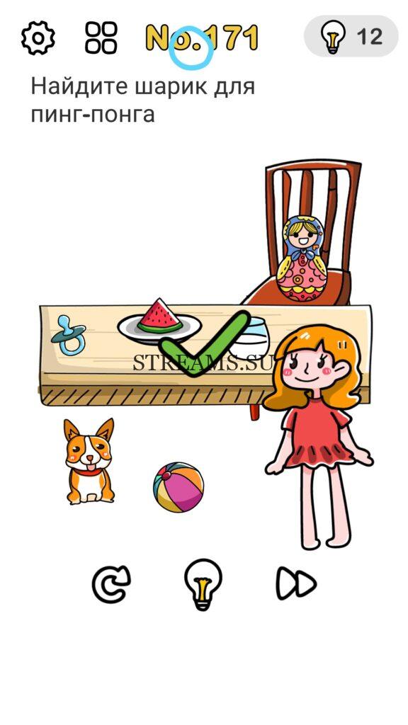Найдите шарик для пинг-понга. Уровень 171 — Brain Out: Ответ на этот уровень находится чуть ниже. Всегда было интересно узнать каков твой IQ? Эта игра поможет тебе узнать ответ на этот вопрос! В ней встречаются как логические загадки, так и не очень. С помощью этой интересной головоломки вы сможете развить нестандартное мышление, креативность, воображение а также улучшить способность запоминать. Некоторые решения задач, могут показаться абсурдными. Играйте в Brain Out с друзьями и родственниками. А если у вас не получается пройти один или несколько уровней, вы можете воспользоваться подсказками с нашего сайта.
