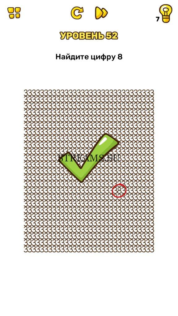 Найдите цифру 8. Уровень 52 — Brain Blow: Тест на гениальность — Ответ на этот уровень находится под фото. Очередная игра от популярных разработчиков головоломок CASUAL AZUR GAMES. Если вы хотите взорвать свой мозг и развить навыки нестандартного мышления, тогда игра Брейн Блоу определенно вам понравится. Если не получается решить задание, то попробуйте включить нестандартное мышление, тряхнуть телефон, погладить его или использовать больше пальцев. Эта игра способна развить в вас навыки следопыта, креативность и прокачать ваш IQ. Но, а если все-же не получается пройти уровень, найдите правильное решение на нашем сайте.