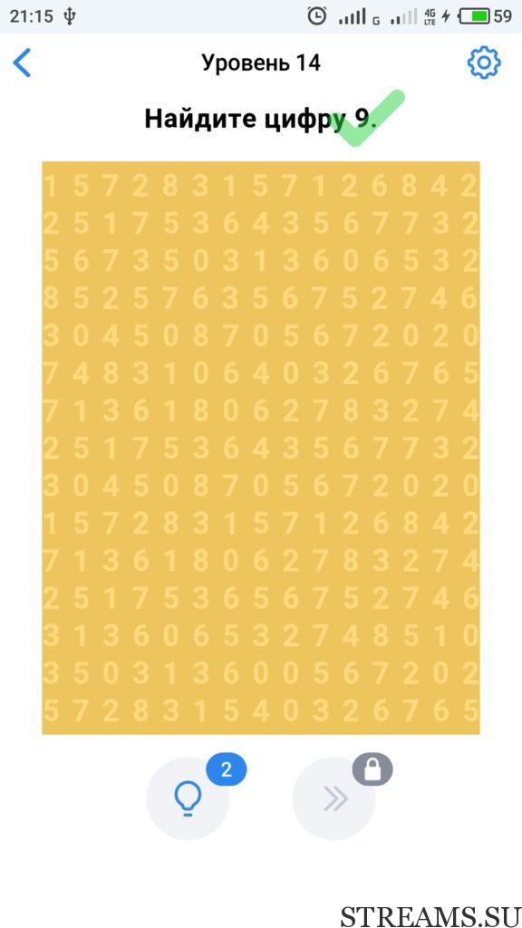 Найдите цифру 9. 14 уровень Easy Game — это интересная но в тоже время сложная головоломка, которая заставит вас включить нестандартное мышление. Прокачайте свой мозг и IQ. Почувствуйте себя самым умным, решая захватывающие и заковыристые задачки. Разработчики Easybrain, обещают, что с помощью этой игры вы сможете развить творческие навыки. Но если не сможете пройти какой-нибудь из уровней, то воспользуйтесь ответами с нашего сайта.