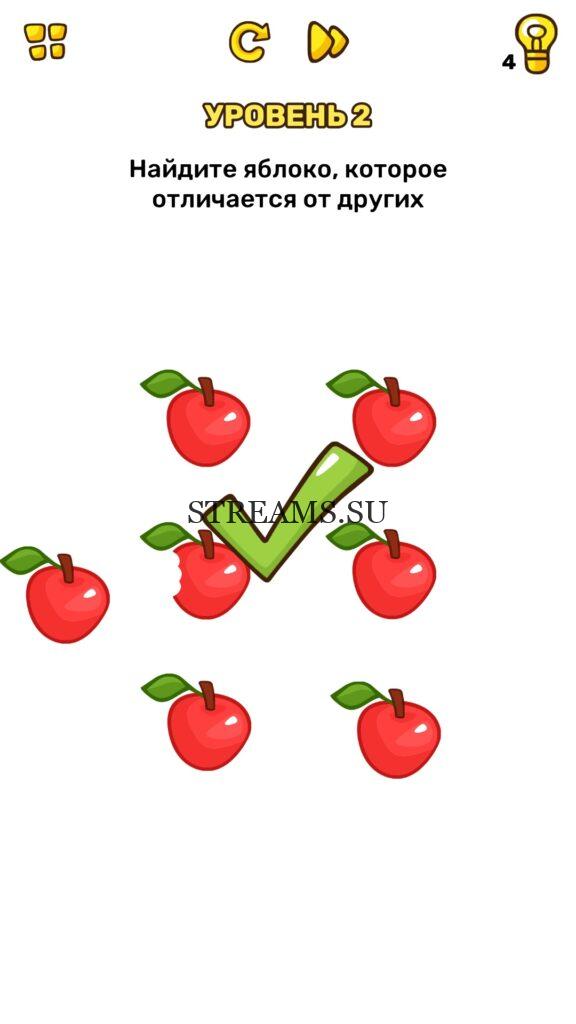 Найдите яблоко, которое отличается от других. Уровень 2 — Brain Blow: Тест на гениальность — Ответ на этот уровень находится под фото. Очередная игра от популярных разработчиков головоломок CASUAL AZUR GAMES. Если вы хотите взорвать свой мозг и развить навыки нестандартного мышления, тогда игра Брейн Блоу определенно вам понравится. Если не получается решить задание, то попробуйте включить нестандартное мышление, тряхнуть телефон, погладить его или использовать больше пальцев. Эта игра способна развить в вас навыки следопыта, креативность и прокачать ваш IQ. Но, а если все-же не получается пройти уровень, найдите правильное решение на нашем сайте.