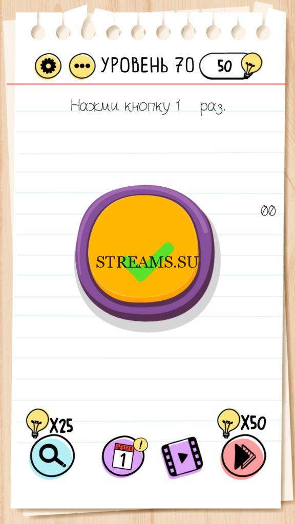 Нажми кнопку 100 раз. Уровень 70 — Brain Test — Это самая популярная головоломка, в которой вам предстоит разгадывать непростые задачки. Нужно будет искать нестандартные решения. Название игры говорит само за себя (Тест мозга). С её помощью вы сможете повысить свой IQ, и интеллект. Иногда ответ может быть очень прост. Вы можете играть в компании друзей или родных. Брейн Тест, это отличный способ провести время с пользой и узнать насколько ты умный. Но если вы не можете решить один или несколько уровней, то воспользуйтесь подсказками с нашего сайта.