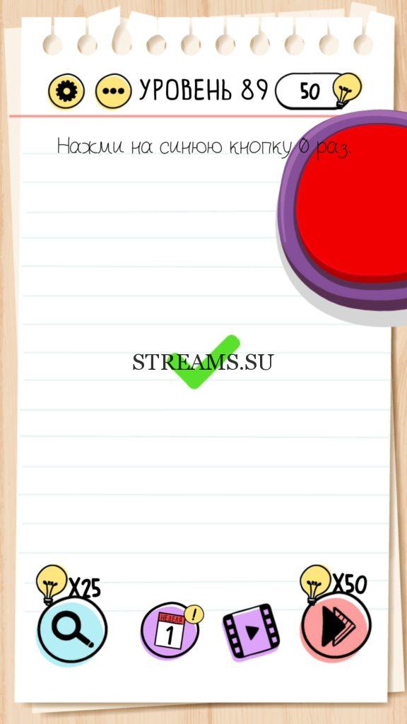 Нажми на синюю кнопку 6 раз. Уровень 89 — Brain Test — Это самая популярная головоломка, в которой вам предстоит разгадывать непростые задачки. Нужно будет искать нестандартные решения. Название игры говорит само за себя (Тест мозга). С её помощью вы сможете повысить свой IQ, и интеллект. Иногда ответ может быть очень прост. Вы можете играть в компании друзей или родных. Брейн Тест, это отличный способ провести время с пользой и узнать насколько ты умный. Но если вы не можете решить один или несколько уровней, то воспользуйтесь подсказками с нашего сайта.