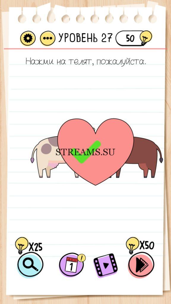 Нажми на телят, пожалуйста. Уровень 27 — Brain Test — Это самая популярная головоломка, в которой вам предстоит разгадывать непростые задачки. Нужно будет искать нестандартные решения. Название игры говорит само за себя (Тест мозга). С её помощью вы сможете повысить свой IQ, и интеллект. Иногда ответ может быть очень прост. Вы можете играть в компании друзей или родных. Брейн Тест, это отличный способ провести время с пользой и узнать насколько ты умный. Но если вы не можете решить один или несколько уровней, то воспользуйтесь подсказками с нашего сайта.