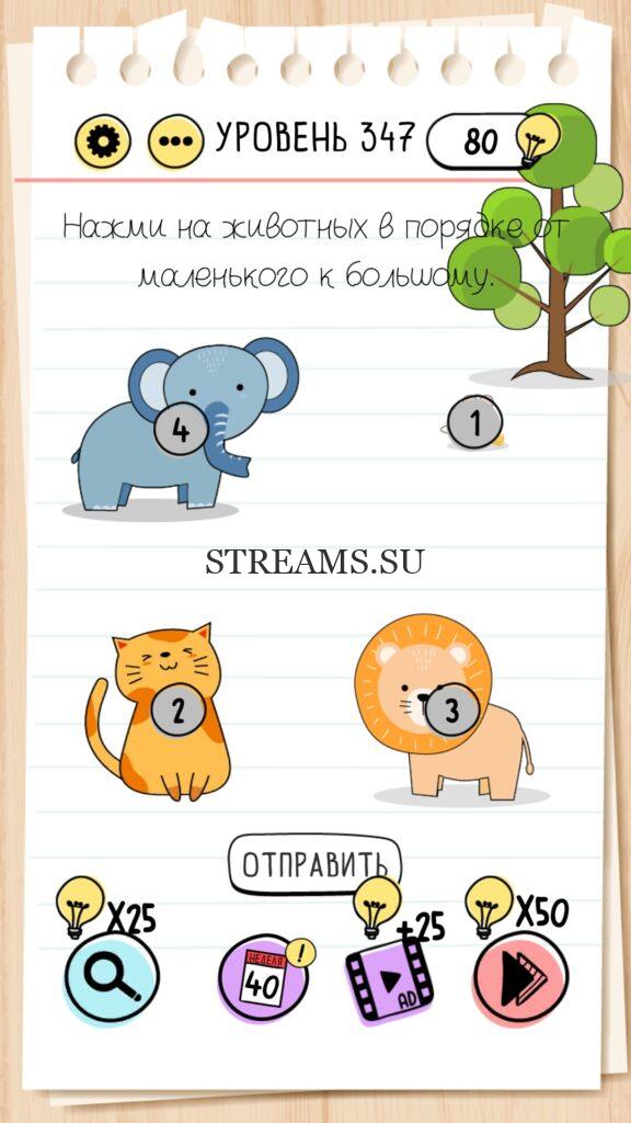 Нажми на животных в порядке от маленького к большому. Уровень 347 — Brain Test — Это самая популярная головоломка, в которой вам предстоит разгадывать непростые задачки. Нужно будет искать нестандартные решения. Название игры говорит само за себя (Тест мозга). С её помощью вы сможете повысить свой IQ, и интеллект. Иногда ответ может быть очень прост. Вы можете играть в компании друзей или родных. Брейн Тест, это отличный способ провести время с пользой и узнать насколько ты умный. Но если вы не можете решить один или несколько уровней, то воспользуйтесь подсказками с нашего сайта.