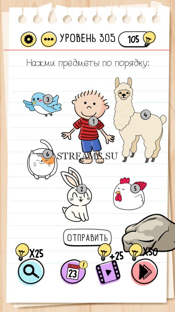 Нажми предметы по порядку: Мальчик-Кролик-Птичка-Лама-Курочка-Кот. Уровень 305 — Brain Test — Это самая популярная головоломка, в которой вам предстоит разгадывать непростые задачки. Нужно будет искать нестандартные решения. Название игры говорит само за себя (Тест мозга). С её помощью вы сможете повысить свой IQ, и интеллект. Иногда ответ может быть очень прост. Вы можете играть в компании друзей или родных. Брейн Тест, это отличный способ провести время с пользой и узнать насколько ты умный. Но если вы не можете решить один или несколько уровней, то воспользуйтесь подсказками с нашего сайта.