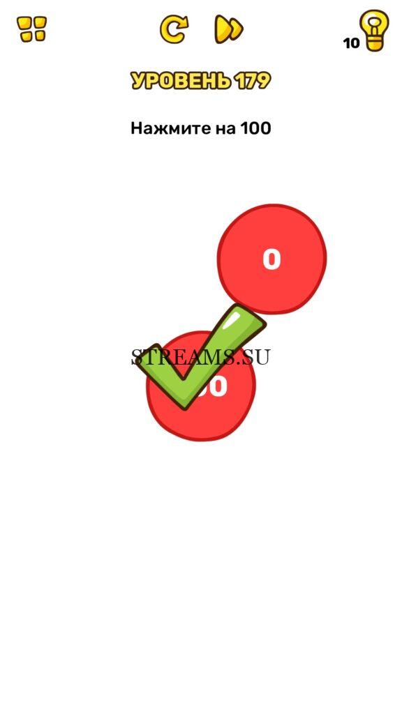 Нажмите на 100. Уровень 179 — Brain Blow: Тест на гениальность — Ответ на этот уровень находится под фото. Очередная игра от популярных разработчиков головоломок CASUAL AZUR GAMES. Если вы хотите взорвать свой мозг и развить навыки нестандартного мышления, тогда игра Брейн Блоу определенно вам понравится. Если не получается решить задание, то попробуйте включить нестандартное мышление, тряхнуть телефон, погладить его или использовать больше пальцев. Эта игра способна развить в вас навыки следопыта, креативность и прокачать ваш IQ. Но, а если все-же не получается пройти уровень, найдите правильное решение на нашем сайте.