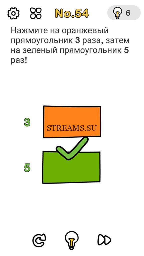 Нажмите на оранжевый прямоугольник 3 раза, затем на зеленый прямоугольник 5 раз! Уровень 54 — Brain Out: Ответ на этот уровень находится чуть ниже. Всегда было интересно узнать каков твой IQ? Эта игра поможет тебе узнать ответ на этот вопрос! В ней встречаются как логические загадки, так и не очень. С помощью этой интересной головоломки вы сможете развить нестандартное мышление, креативность, воображение а также улучшить способность запоминать. Некоторые решения задач, могут показаться абсурдными. Играйте в Brain Out с друзьями и родственниками. А если у вас не получается пройти один или несколько уровней, вы можете воспользоваться подсказками с нашего сайта.