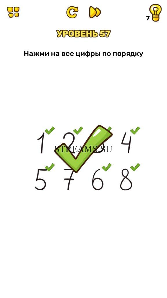Нажмите на все цифры по порядку. Уровень 57 — Brain Blow: Тест на гениальность — Ответ на этот уровень находится под фото. Очередная игра от популярных разработчиков головоломок CASUAL AZUR GAMES. Если вы хотите взорвать свой мозг и развить навыки нестандартного мышления, тогда игра Брейн Блоу определенно вам понравится. Если не получается решить задание, то попробуйте включить нестандартное мышление, тряхнуть телефон, погладить его или использовать больше пальцев. Эта игра способна развить в вас навыки следопыта, креативность и прокачать ваш IQ. Но, а если все-же не получается пройти уровень, найдите правильное решение на нашем сайте.