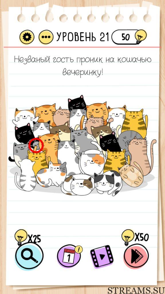 Незваный гость проник на кошачью вечеринку! Уровень 21 — Brain Test — Это самая популярная головоломка, в которой вам предстоит разгадывать непростые задачки. Нужно будет искать нестандартные решения. Название игры говорит само за себя (Тест мозга). С её помощью вы сможете повысить свой IQ, и интеллект. Иногда ответ может быть очень прост. Вы можете играть в компании друзей или родных. Брейн Тест, это отличный способ провести время с пользой и узнать насколько ты умный. Но если вы не можете решить один или несколько уровней, то воспользуйтесь подсказками с нашего сайта.