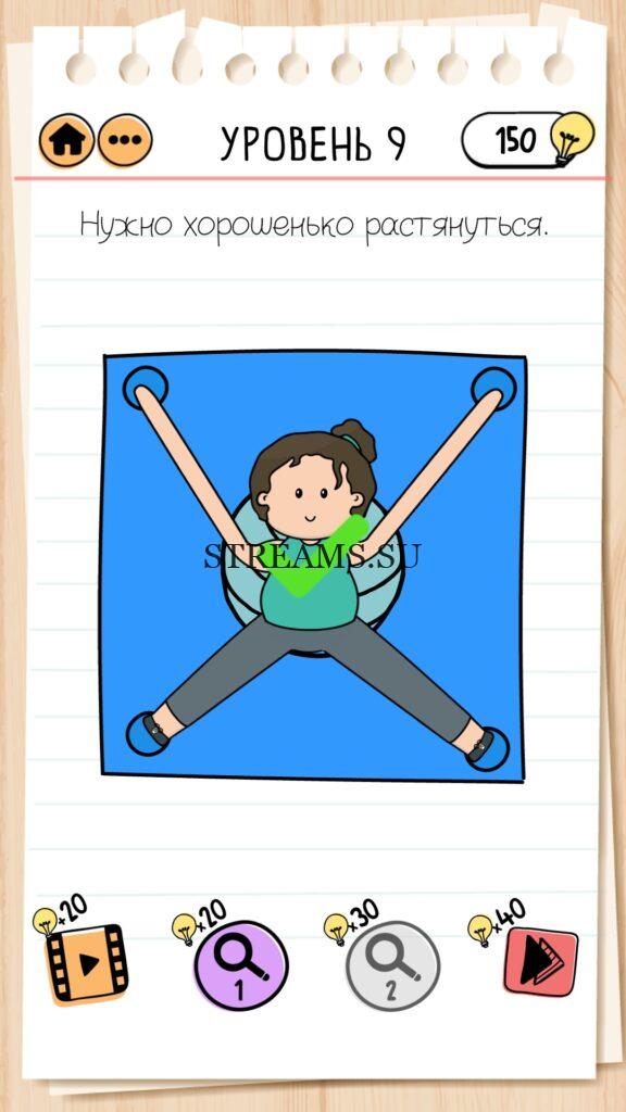 Нужно хорошенько растянуться. Уровень 9 — Brain Test 2 (Худеем с Настей): Вторая часть замечательной игры уже здесь. Готовы к испытанию своего мозга на прочность? Тогда смело залетайте в эту головоломку. Здесь нас ждет непредсказуемые задачки, вопросы и головоломки, которые сразу и не получиться решить. Будьте готовы к вопросам с подвохом! Попробуйте решить все уровни. Эта головоломка построена по принципу историй. В каждой истории придется помогать кому-то решить бытовые вопросы; вычислить преступника; помочь похудеть. Это лишь некоторые эпизоды которые нас ожидают в этой игре. Очень красочная игра, которая понравится и вам и вашим друзьям. Если не получается пройти загадку, то на нашем сайте STREAMS.SU вы найдете решение любого уровня Brain Test 2!