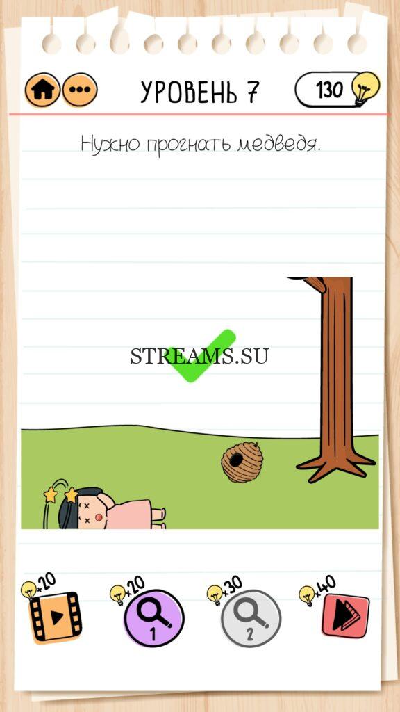 Нужно прогнать медведя. Уровень 7 — Brain Test 2 (Невезучая Надя): Вторая часть замечательной игры уже здесь. Готовы к испытанию своего мозга на прочность? Тогда смело залетайте в эту головоломку. Здесь нас ждет непредсказуемые задачки, вопросы и головоломки, которые сразу и не получиться решить. Будьте готовы к вопросам с подвохом! Попробуйте решить все уровни. Эта головоломка построена по принципу историй. В каждой истории придется помогать кому-то решить бытовые вопросы; вычислить преступника; помочь похудеть. Это лишь некоторые эпизоды которые нас ожидают в этой игре. Очень красочная игра, которая понравится и вам и вашим друзьям. Если не получается пройти загадку, то на нашем сайте STREAMS.SU вы найдете решение любого уровня Brain Test 2!