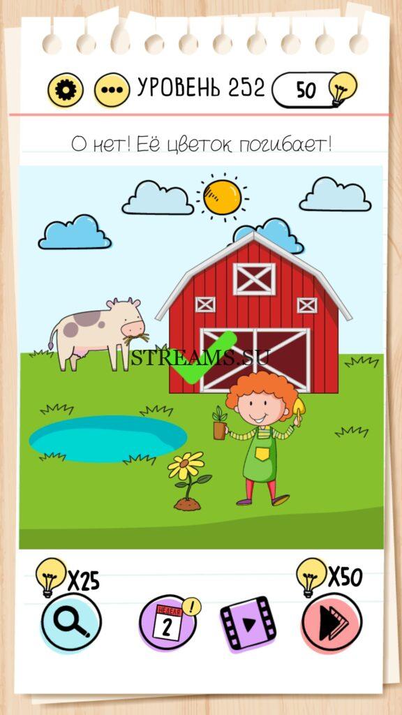 О нет! Её цветок умирает! Уровень 252 — Brain Test — Это самая популярная головоломка, в которой вам предстоит разгадывать непростые задачки. Нужно будет искать нестандартные решения. Название игры говорит само за себя (Тест мозга). С её помощью вы сможете повысить свой IQ, и интеллект. Иногда ответ может быть очень прост. Вы можете играть в компании друзей или родных. Брейн Тест, это отличный способ провести время с пользой и узнать насколько ты умный. Но если вы не можете решить один или несколько уровней, то воспользуйтесь подсказками с нашего сайта.