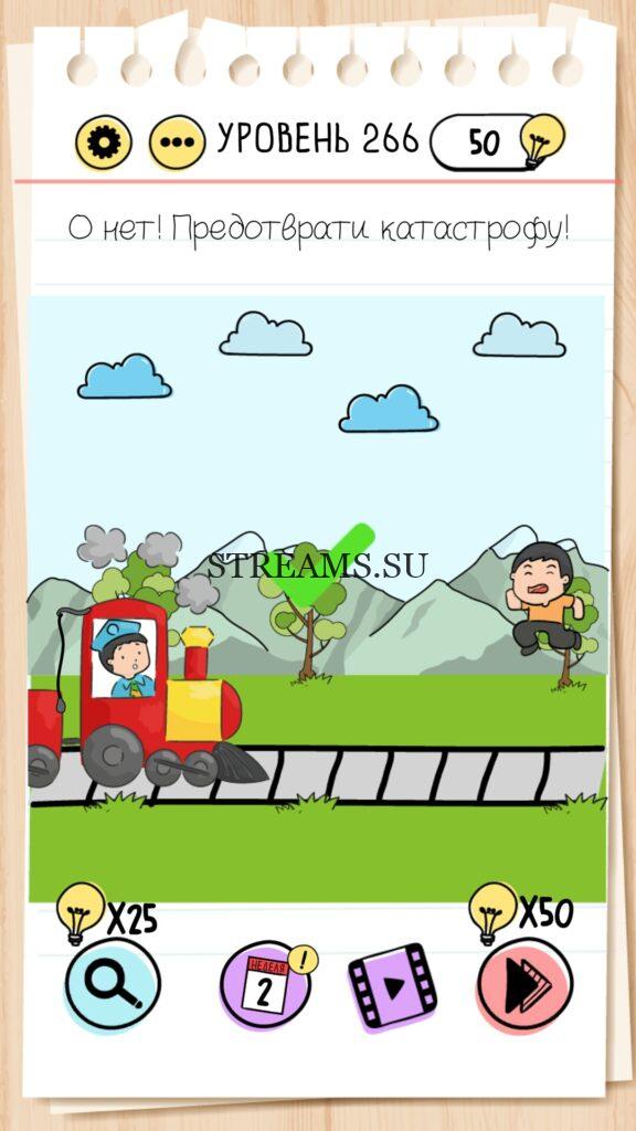 О нет! Предотврати катастрофу! Уровень 266 — Brain Test — Это самая популярная головоломка, в которой вам предстоит разгадывать непростые задачки. Нужно будет искать нестандартные решения. Название игры говорит само за себя (Тест мозга). С её помощью вы сможете повысить свой IQ, и интеллект. Иногда ответ может быть очень прост. Вы можете играть в компании друзей или родных. Брейн Тест, это отличный способ провести время с пользой и узнать насколько ты умный. Но если вы не можете решить один или несколько уровней, то воспользуйтесь подсказками с нашего сайта.