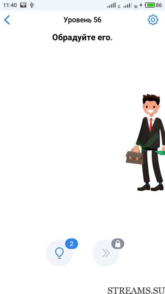 Обрадуйте его. 56 уровень Easy Game — это интересная но в тоже время сложная головоломка, которая заставит вас включить нестандартное мышление. Прокачайте свой мозг и IQ. Почувствуйте себя самым умным, решая захватывающие и заковыристые задачки. Разработчики Easybrain, обещают, что с помощью этой игры вы сможете развить творческие навыки. Но если не сможете пройти какой-нибудь из уровней, то воспользуйтесь ответами с нашего сайта.